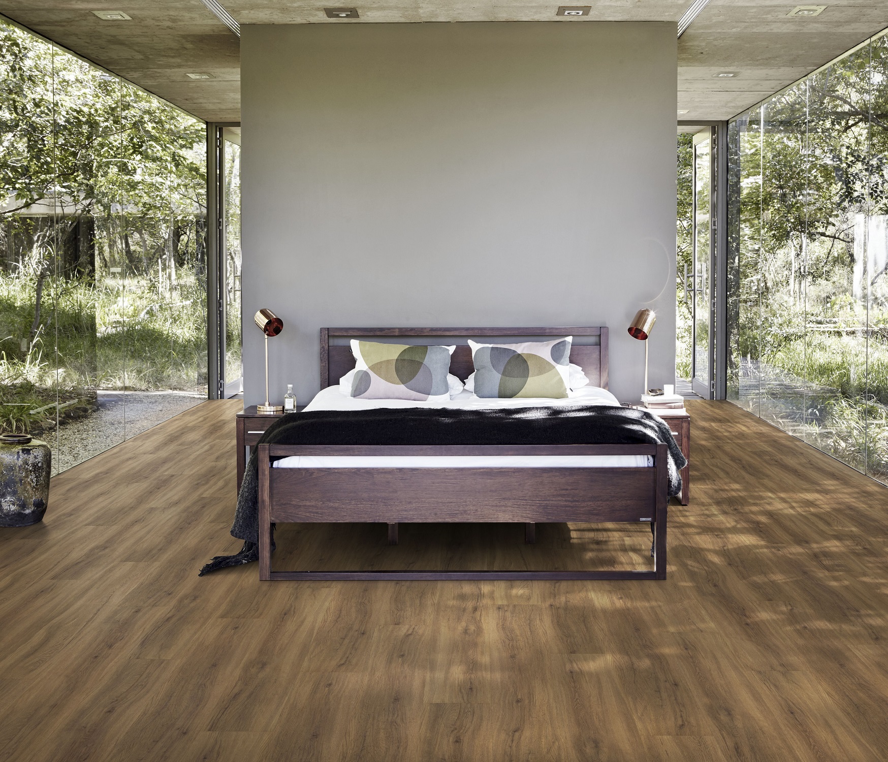 Kahrs Craft Nature Redwood will complement any interior design concept. With warm dark brown tones and a grain texture with knots, this vinyl tile looks like natural wood but is also durable and easy to maintain. All the Kahrs Craft range floors have an integrated IXPE underlay, making them easy to install—100% waterproof and durable hygienic flooring.
