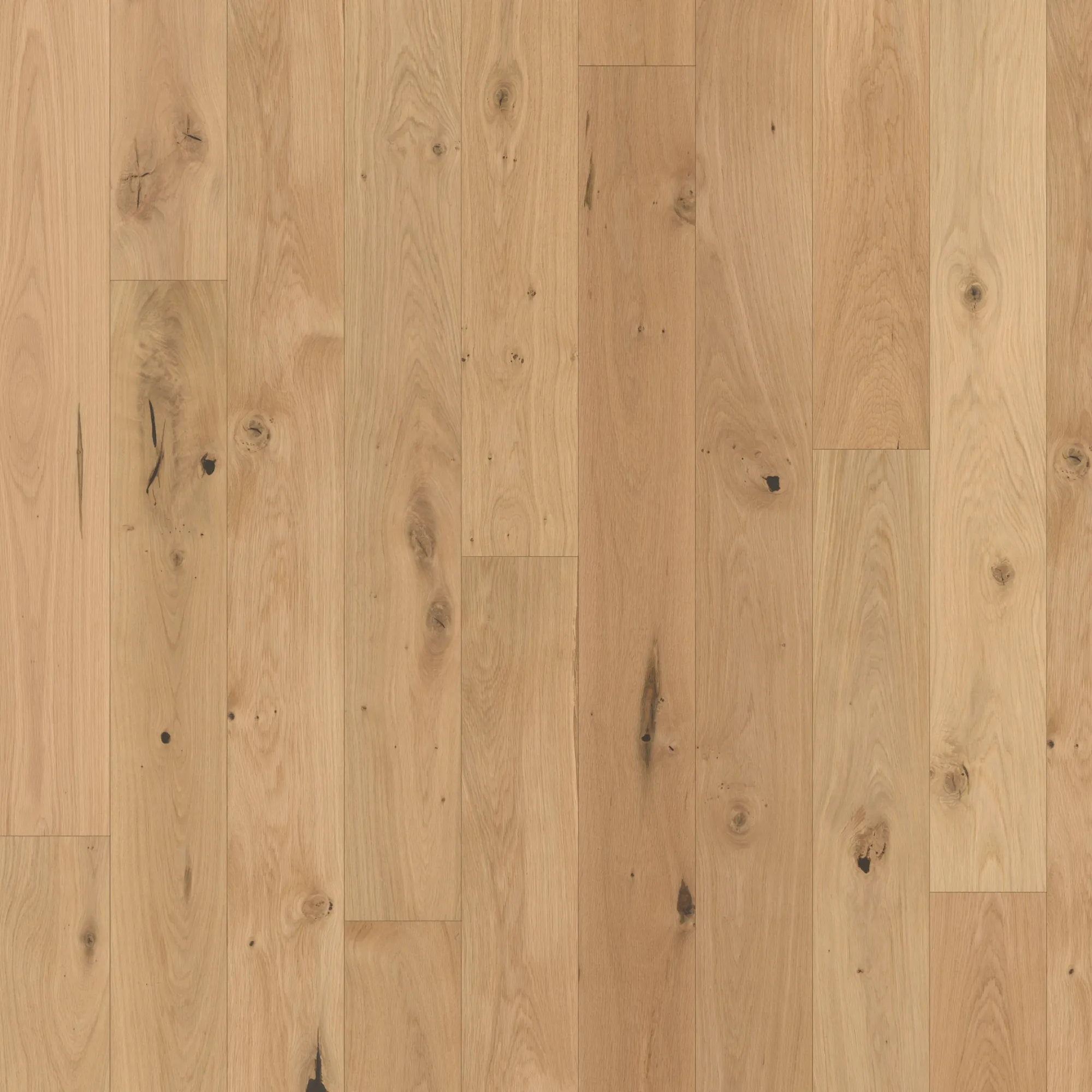 Oak Iris features a light white wash with a subtle rohoptic nuance that harmonizes darker wood grains, knots, and natural cracks. The narrow planks enhance the floor’s elegant and modern character, while the brushed, matt lacquered surface highlights the natural texture of the oak, allowing nature’s patterns to stand out beautifully.