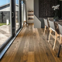 Warm, smoked oak with a lovely mix of tones gives this floor a fantastic look. Add to this a brushed surface and micro-bevelled edges the character-grade oak planks come alive, creating a wonderful combination all working together. Plus, with Kahrs new ultra matt lacquer, it is the perfect big wide plank floor.