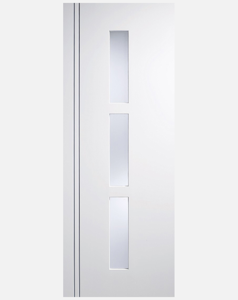 Sierra Blanco is ultra-modern with a smooth surface with vertical aluminium strip inlay. Finished with a warm white painted finish, these doors will look fantastic in contemporary and traditional home interiors. Also available as a matching 3-light with frosted laminated glass and as a clear glass option to further enhance your interior design while allowing additional light to flow through from adjoining rooms. Available as standard doors and as FD30 fire doors. These doors are pre-finished and ready for installation.