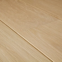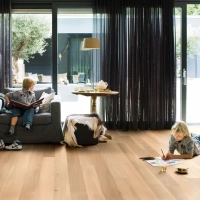 A lovely, calm, prime-grade oak floor with a superb extra-matt lacquer finish that will add a feeling of light and space to any room. This stylish engineered oak flooring combines high-end European construction with Scandinavian flair. This board is bevelled along the length to create a feeling of length and continuity. The lightly brushed surface and extra-matt lacquer finish look smart in contemporary or traditional interiors—a superb offering from Quick-Step.