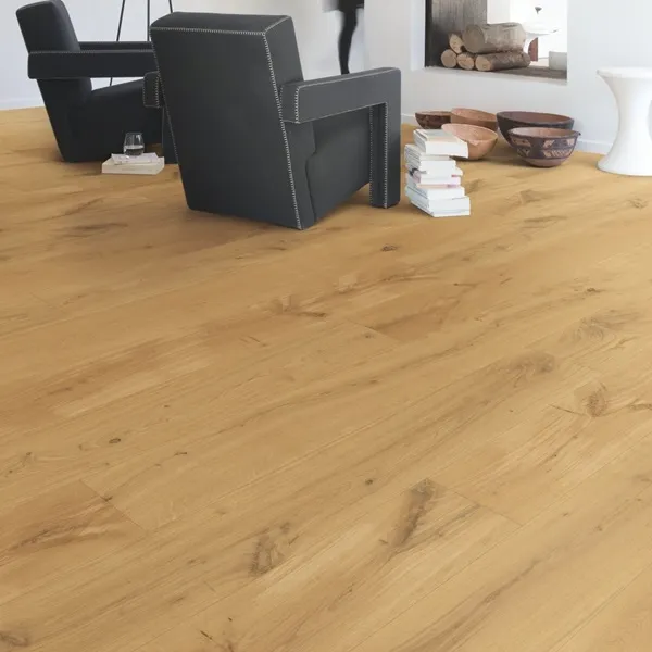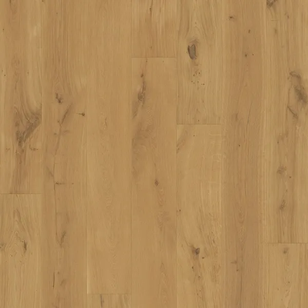 Enhance your home with the natural beauty of Quick-Step Faro Natural Oak, featuring medium-toned rustic-grade oak in an extra-wide 220mm plank. This engineered wood floor boasts a lightly brushed surface with bevelled edges on all sides, emphasising the unique character of each board. The stylish extra-matt lacquer finish offers a modern, understated look perfect for both contemporary and traditional interiors.