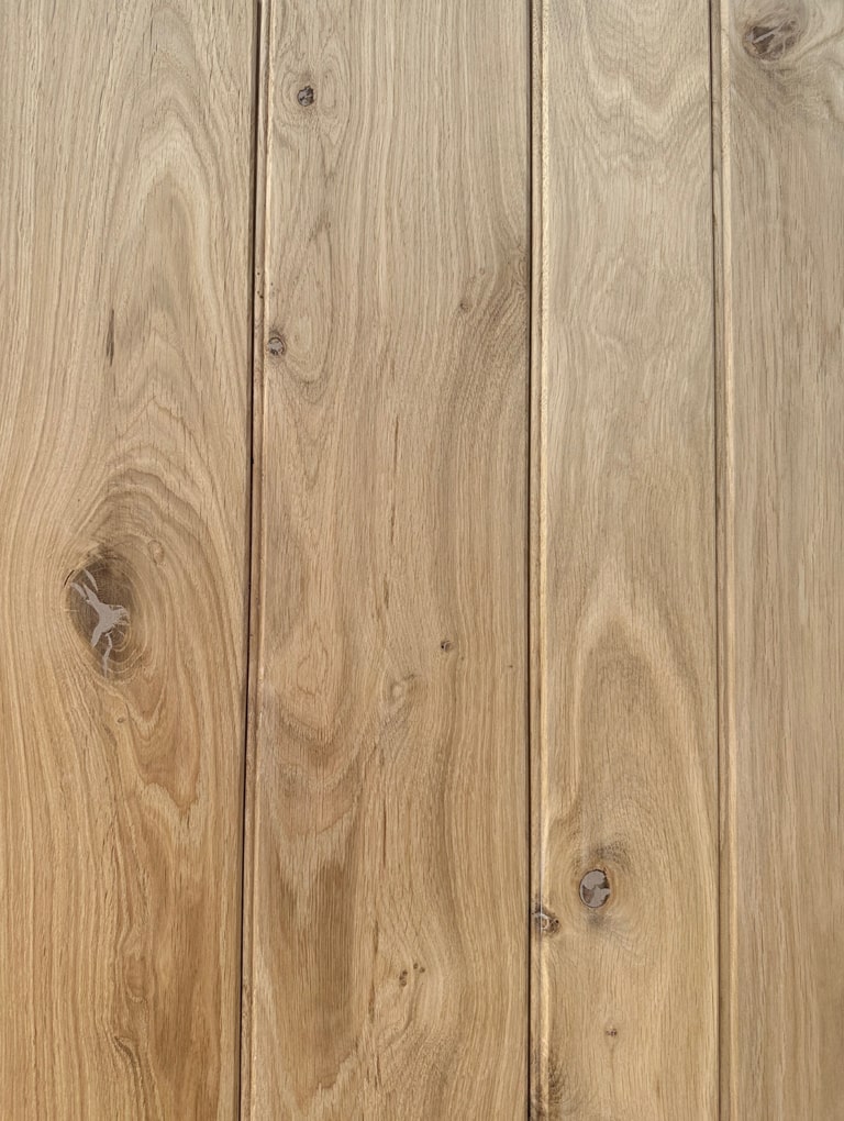 Our solid oak ledge design cottage doors are hand-made from sustainably sourced rustic-grade French oak. Butt and bead design with v-groove detail on the rear. These traditional cottage doors have three chamfered ledges, glued and fixed with screws, and covered with discreet oak plugs that are sanded flush with the door's surface. The glue and screw method ensures a stable construction. Knots are carefully hand-filled and sanded, ready for final finishing. This saves significant time, effort, and disruption at the installation stage.