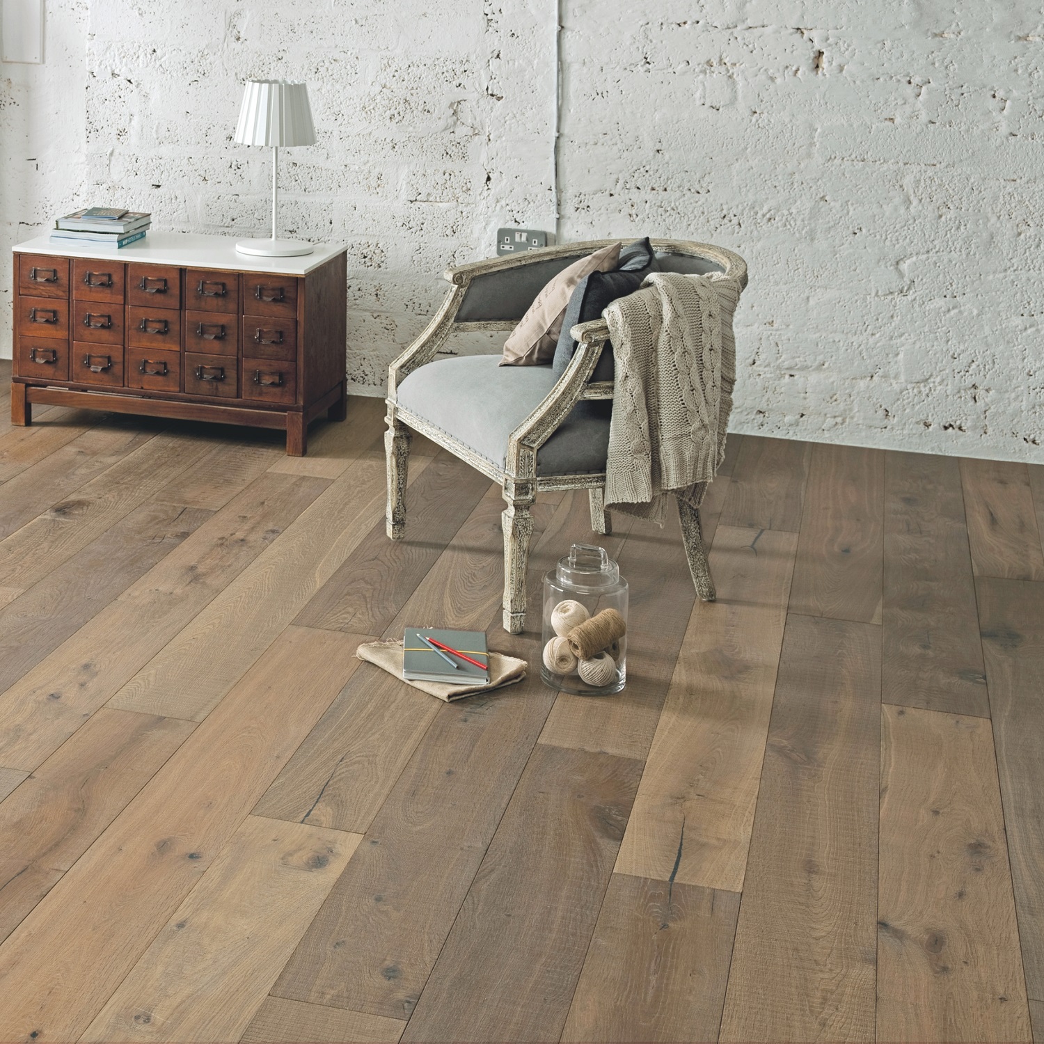 A beautiful handcrafted oak floor with saw marks and lots of natural beauty. Further enhanced with bevelled edges on all sides, a deeply brushed surface with a lightly smoked and oiled finish defines the texture of the wood. Suitable for use over underfloor heating.