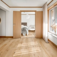 Oak Iris features a light white wash with a subtle rohoptic nuance that harmonizes darker wood grains, knots, and natural cracks. The narrow planks enhance the floor’s elegant and modern character, while the brushed, matt lacquered surface highlights the natural texture of the oak, allowing nature’s patterns to stand out beautifully.