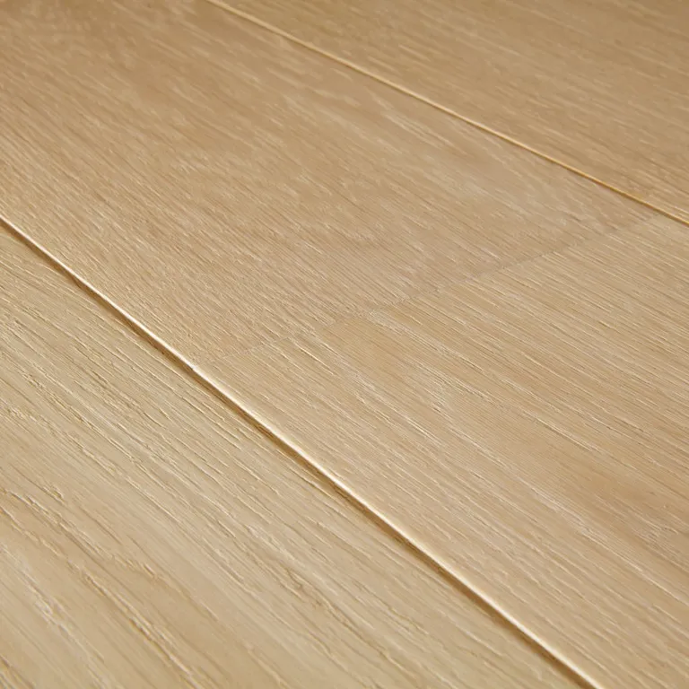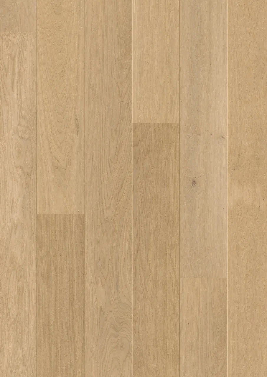 A lovely, calm, prime-grade oak floor with a superb extra-matt lacquer finish that will add a feeling of light and space to any room. This stylish engineered oak flooring combines high-end European construction with Scandinavian flair. This board is bevelled along the length to create a feeling of length and continuity. The lightly brushed surface and extra-matt lacquer finish look smart in contemporary or traditional interiors—a superb offering from Quick-Step.